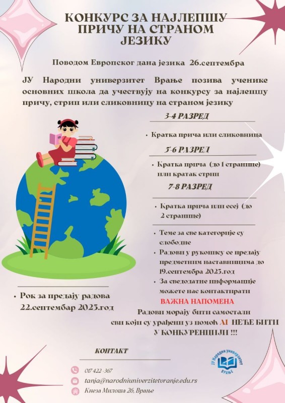 Јавна установа Народни универзитет Врање, у сарадњи са основним и средњим школама града и ове године обележава 26. септембар – Дан европских језика. Програм се састоји из два сегмента: конкурс за најлепшу причу на страном језику и завршна свечаност – ,,Песма Евровизије“. Конкурс за најлепшу причу на страном језику биће организован у три узрасне категорије: