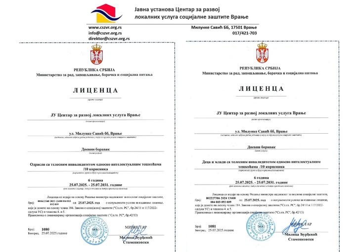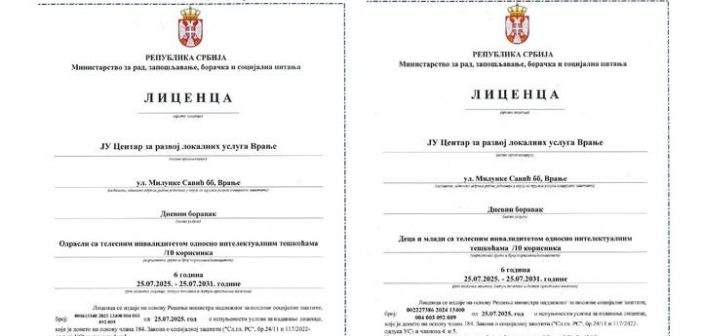 Јавна установа Центар за развој локалних услуга Врање добила је две нове лиценце Министарства за рад, запошљавање, борачка и социјална питања и то: