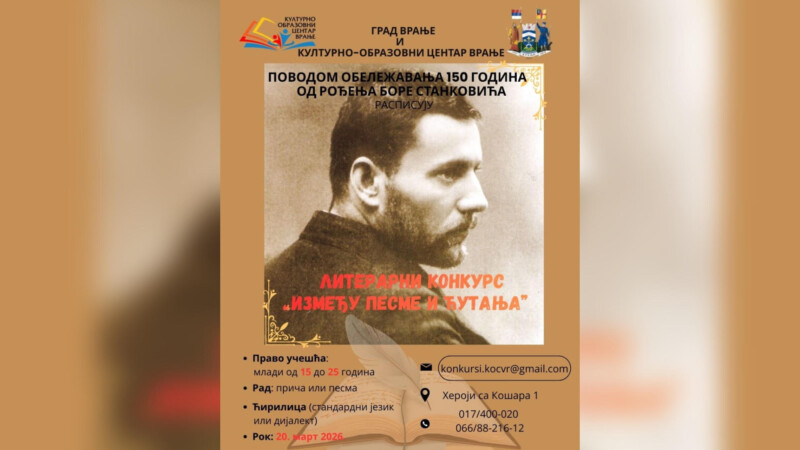 Поводом обележавања 150 година од рођења Борисава Станковића, Град Врање и Културно-образовни центар расписали су литерарни конкурс на тему ,,Између песме и ћутања“.